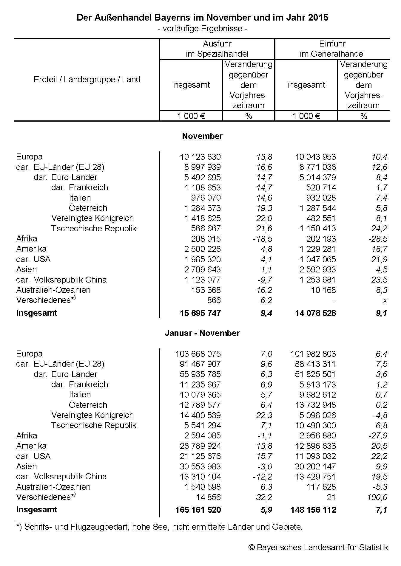 Die bayerische Wirtschaft exportierte nach vorläufigen Ergebnissen des Bayerischen Landesamts für Statistik im November 2015 Waren im Wert von 15,7 Milliarden Euro, 9,4 Prozent mehr als im Vorjahresmonat. Zeitgleich importierte sie Waren im Wert von 14,1 Milliarden Euro (+9,1 Prozent). 57 Prozent der bayerischen Ausfuhren gingen in die EU-Mitgliedsstaaten, darunter wurden 35 Prozent der Ausfuhren in die Euro-Länder geliefert. 62 Prozent der Einfuhren bezog Bayern aus den Ländern der Europäischen Union, darunter kamen 36 Prozent der Einfuhren aus den Ländern der Euro-Zone. – In den ersten elf Monaten 2015 exportierte Bayern Waren im Wert von 165,2 Milliarden Euro (+5,9 Prozent gegenüber dem Vorjahreszeitraum) und importierte Waren im Wert von 148,2 Milliarden Euro (+7,1 Prozent).
