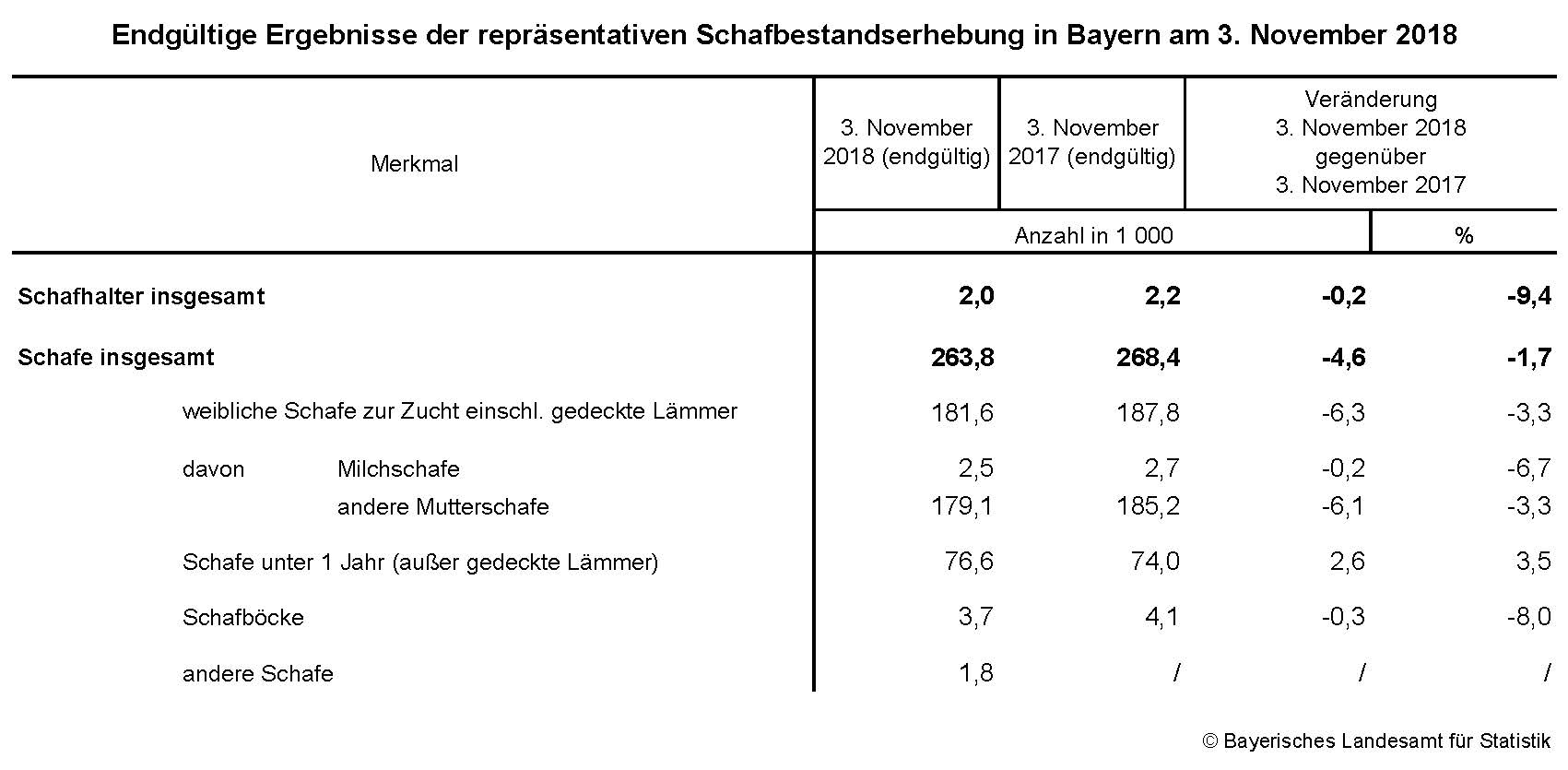 Nach den endgültigen Ergebnissen der vom Bayerischen Landesamt für Statistik durchgeführten Erhebung über die Schafbestände am 3. November 2018 ist die Zahl der Tiere auf rund 263 800 zurückgegangen, das entspricht einem leichten Minus von 1,7 Prozent gegenüber dem Vorjahr. Deutlich stärker rückläufig war hingegen die Zahl der Betriebe. Mit nur noch knapp 2 000 wurden im November 2018 9,4 Prozent weniger Schafhalter gezählt als ein Jahr zuvor.