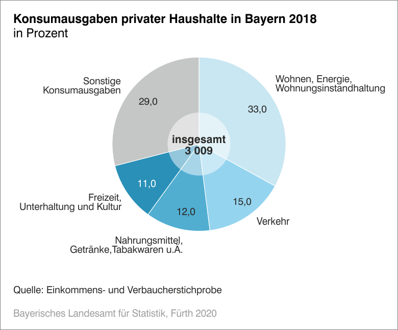 Nach den Ergebnissen der Einkommens- und Verbrauchsstichprobe 2018 gab der Durchschnittshaushalt in Bayern 3 010 Euro im Monat für den privaten Konsum aus. An der entsprechenden bundesweiten Erhebung nahmen in Bayern 8 272 Haushalte teil, die für jeweils ein Quartal ein Haushaltsbuch führten, in dem sie alle Einnahmen und Ausgaben notierten. Die teilnehmenden Haushalte repräsentierten rund 6,27 Millionen Haushalte in Bayern (ohne Haushalte mit einem monatlichen Haushaltsnettoeinkommen von regelmäßig 18 000 Euro oder mehr).