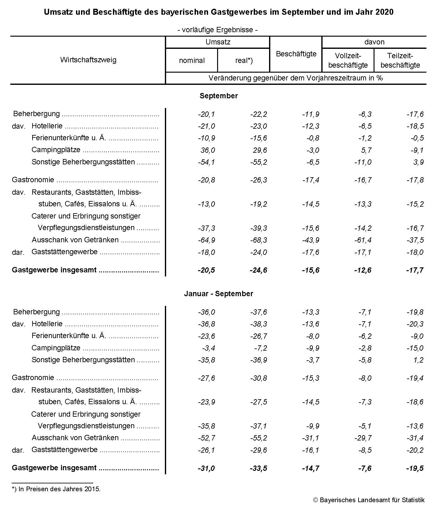 Im September 2020 nahm der Umsatz im bayerischen Gastgewerbe im Vergleich zum Vorjahresmonat nominal um 20,5 Prozent und real um 24,6 Prozent ab. Die Beschäftigtenzahl verringerte sich um 15,6 Prozent. Im Vergleich zum August 2020 sank der Umsatz im Gastgewerbe nominal um 3,5 Prozent, die Zahl der Beschäftigten stieg um 0,7 Prozent.