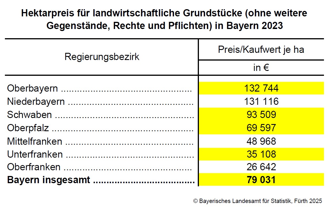 Im Schnitt werden im Jahr 2023 im Freistaat landwirtschaftliche Grundstücke zum Wert von 79 031 Euro (alt: 77 305 Euro) je Hektar (7,90 Euro je Quadratmeter) (alt: 7,73 Euro je Quadratmeter) verkauft. Der Unterschied zwischen den durchschnittlichen Kaufwerten je Hektar ist in den einzelnen Regierungsbezirken erheblich. Am höchsten ist er mit 132 744 Euro (alt: 133 085 Euro) in Oberbayern und 131 116 Euro in Niederbayern. Der niedrigste Verkaufswert errechnet sich mit 26 642 Euro für den Regierungsbezirk Oberfranken. Deutlich unter dem Landesmittel liegt auch der in Unterfranken erzielte Hektarerlös (35 108 Euro) (alt: 33 675 Euro).