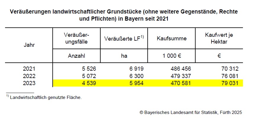 Im Jahr 2023 werden in Bayern 4 539 (alt: 4 646) landwirtschaftliche Grundstücke (ohne weitere Gegenstände, Rechte und Pflichten) mit einer Fläche von 5 954 Hektar (alt: 6 003 Hektar) für insgesamt 470,6 Millionen Euro (alt: 464,0 Millionen Euro) verkauft. Wie das Bayerische Landesamt für Statistik weiter mitteilt, errechnet sich daraus ein durchschnittlicher Kaufwert von 79 031 Euro (alt: 77 305 Euro) je Hektar. Die durchschnittlichen Kaufwerte je Hektar unterscheiden sich je nach Region zum Teil erheblich. Die Bandbreite reicht dabei von 26 642 Euro in Oberfranken bis 132 744 Euro (alt: 133 085 Euro) in Oberbayern.