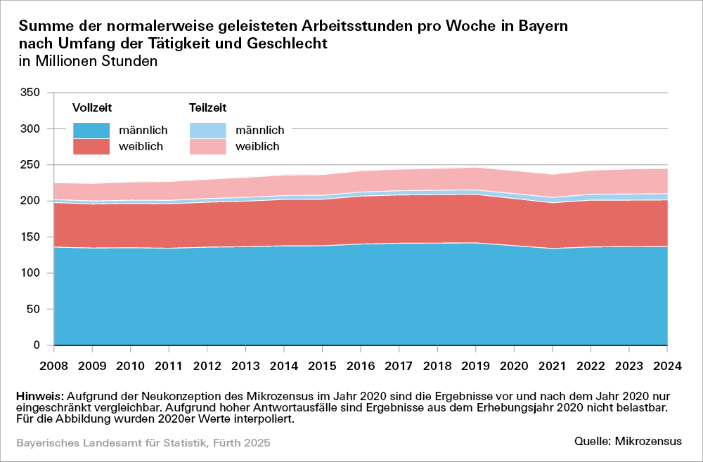 Seit 2008 ist die Zahl der bayerischen Erwerbstätigen von 6,7 Millionen auf 7,9 Millionen im Jahr 2024 gestiegen. Zugleich sinkt jedoch in den letzten Jahren die durchschnittliche Anzahl der Arbeitsstunden je Erwerbstätigen auf zuletzt 1 329 Stunden im Jahr 2024 oder durchschnittlich 25,6 Stunden pro Woche. Das sind 0,1 Prozent weniger als im Vorjahr. Damit ist die Jahresarbeitszeit pro Person weiterhin rückläufig. Grund hierfür ist vor allem die zunehmende Bedeutung von Teilzeitarbeit.