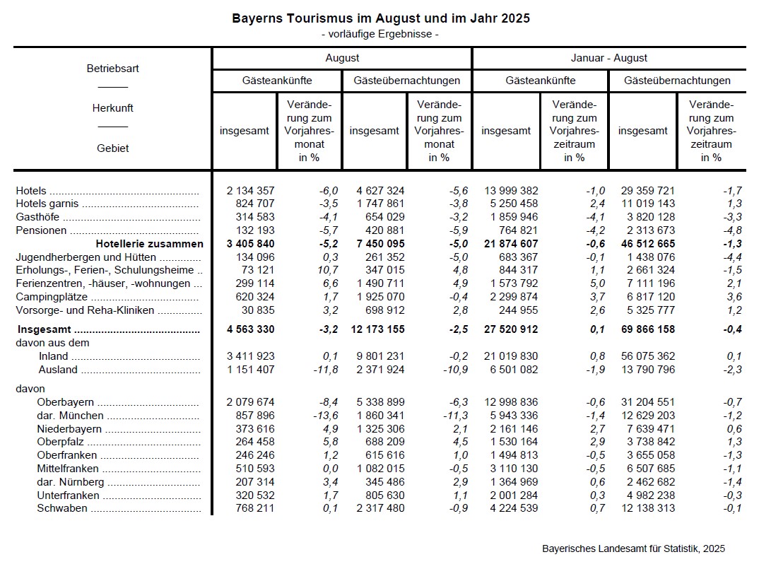 Schweinfurt. Das Bayerische Landesamt für Statistik meldet nach vorläufigen Ergebnissen für August 2025 einen leichten Rückgang der Gästeankünfte und Übernachtungen gegenüber dem Vorjahresmonat. Der Freistaat darf somit knapp 4,6 Millionen Gäste (-3,2 Prozent) begrüßen, welche rund 12,2 Millionen Mal (-2,5 Prozent) in einem der 11 418 geöffneten Beherbergungsbetriebe1) Bayerns übernachten.