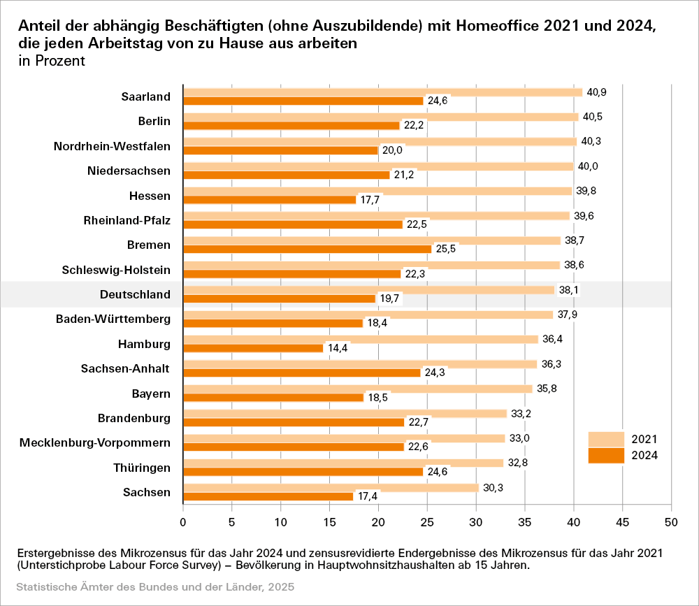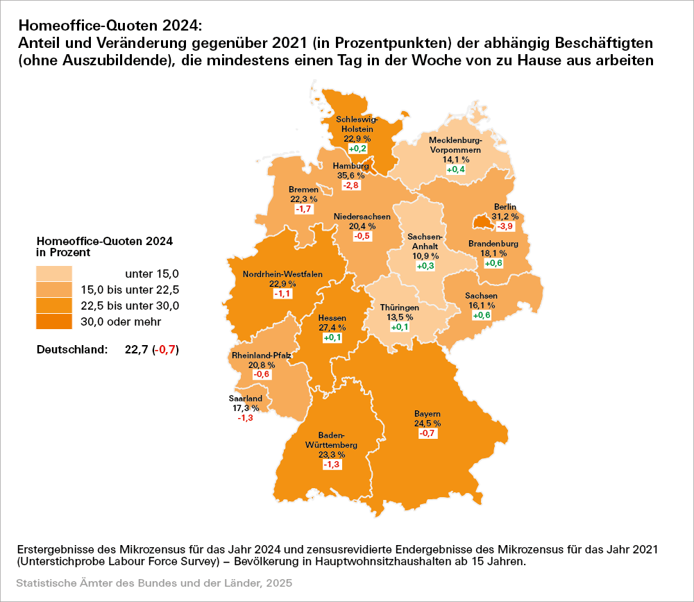 In Rheinland-Pfalz (20,8 Prozent), Niedersachsen (20,4 Prozent), Brandenburg (18,1 Prozent) und dem Saarland (17,3 Prozent) arbeiten die Beschäftigten etwas seltener von zu Hause aus. Die geringsten Homeoffice-Quoten haben Mecklenburg-Vorpommern (14,1 Prozent), Thüringen (13,5 Prozent) und Sachsen-Anhalt (10,9 Prozent).