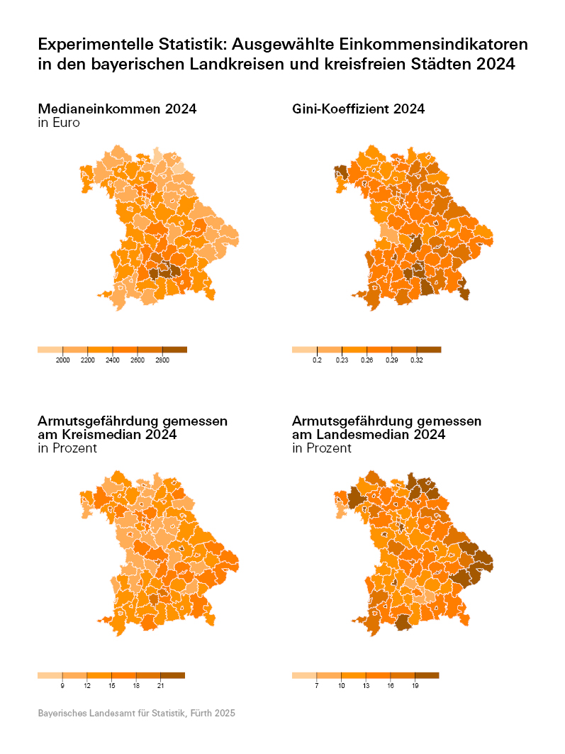 Das Bayerische Landesamt für Statistik veröffentlicht erstmals eine experimentelle Statistik zu Einkommensindikatoren für die bayerischen Landkreise und kreisfreien Städte anhand der Ergebnisse des Mikrozensus. Insgesamt stehen zwölf Indikatoren zur Verfügung, darunter Mittelwert und Median, Armutsgefährdungsquoten sowie der Gini-Koeffizient. Die Ergebnisse zeigen deutliche Unterschiede in der Einkommensverteilung in Bayern: Neben einer Konzentration hoher Einkommen im Münchner Umland, wird in den bayerischen Städten eine höhere Einkommensungleichheit als in den umliegenden Landkreisen ermittelt. Der Artikel im Statistik Magazin „Bayern in Zahlen“, beleuchtet ausführlich Methodik und Ergebnisse zum Schätzverfahren und zur Vorgehensweise.