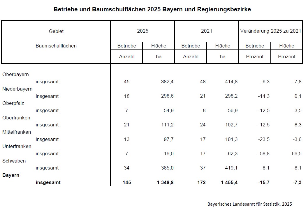 Fürth. Wie das Fachteam des Bayerischen Landesamtes für Statistik auf Basis der alle vier Jahre stattfindenden Baumschulerhebung mitteilt, wird in Bayern im Jahr 2025 eine Baumschulfläche von 1 349 Hektar (ha) bewirtschaftet. Das sind 106 ha bzw. 7,3 Prozent weniger als im Jahr 2021, als sich die genutzte Fläche noch auf 1 455 ha belief. Etwa 1,0 Prozent – also ca. 13 ha – entfallen auf Flächen in Gewächshäusern oder Flächen unter hohen begehbaren Schutzabdeckungen. Dieses Verhältnis bleibt im Vergleich zu 2021 unverändert.