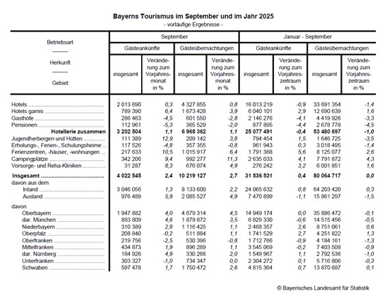 Unter den Regierungsbezirken hat Oberbayern den stärksten Anstieg bei den Übernachtungszahlen verglichen mit September 2024 zu verbuchen (+4,5 Prozent). Schwaben (+2,6 Prozent), Niederbayern (+1,1 Prozent), Oberpfalz (+1,1 Prozent), und Mittelfranken (+1,1 Prozent) zeigen ein Übernachtungs-Plus, während die Übernachtungszahlen in Unterfranken im Vergleich zum Vorjahresmonat unverändert sind (0,0 Prozent). Einen leichten Rückgang der Übernachtungen zeigen Beherbergungsbetriebe in Oberfranken (-0,8 Prozent).