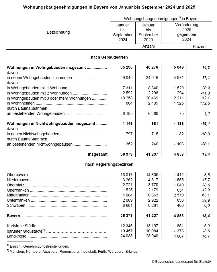 Schweinfurt. In Bayern werden von Januar bis September 2025 Baugenehmigungen (einschließlich Genehmigungsfreistellungen) für insgesamt 41 237 Wohnungen bewilligt. Nach Mitteilung der Fachgruppe im Bayerischen Landesamt für Statistik steigt die Zahl der Wohnungsbaufreigaben damit um 4 858 Wohnungen beziehungsweise 13,4 Prozent gegenüber dem Vorjahreszeitraum.