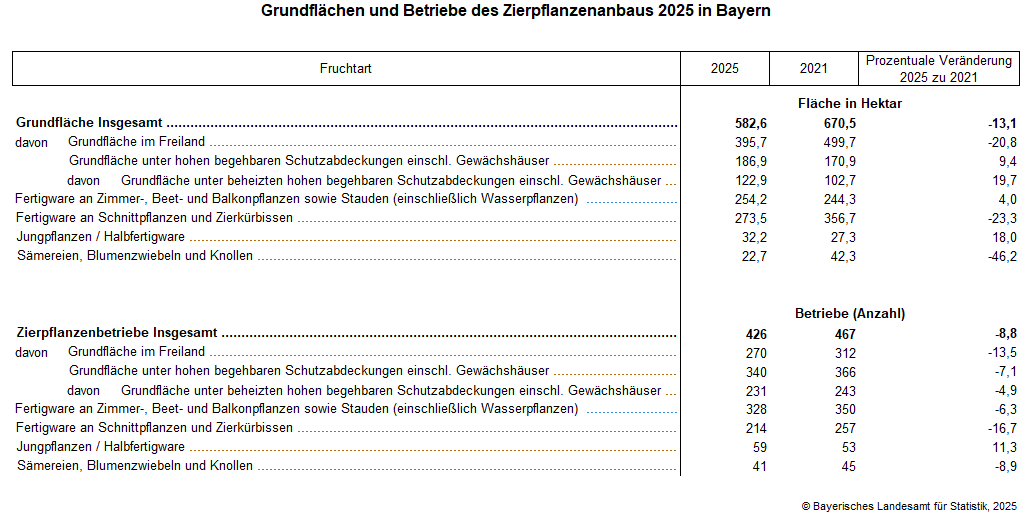 Fürth. Wie das Fachteam des Bayerischen Landesamts für Statistik auf Basis der Zierpflanzenerhebung, die alle vier Jahre stattfindet, mitteilt, reduziert sich im Jahr 2025 die bewirtschaftete Grundfläche der bayerischen Zierpflanzenbetriebe auf 583 Hektar (ha). Im Vergleich zu 2021 (671 ha) bedeutet das einen Rückgang um 88 ha bzw. 13,1 Prozent. Auch die Zahl der Zierpflanzenbetriebe sinkt von 467 auf 426 – ein Minus von 41 Betrieben bzw. 8,8 Prozent.
