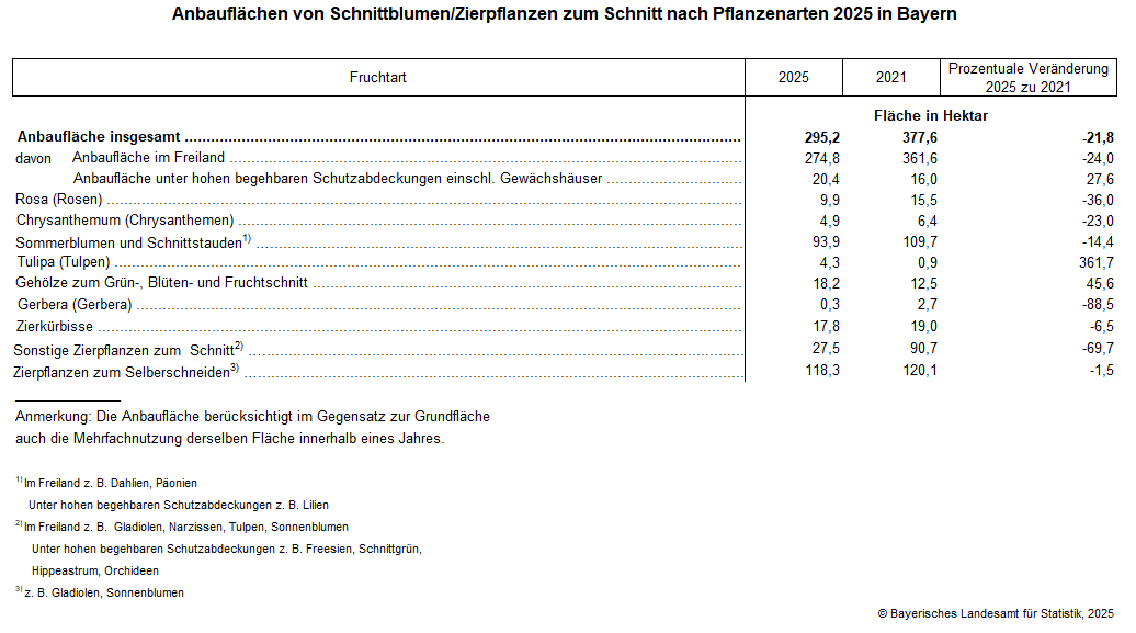 Die Schnittblumenproduktion erfolgt 2025 auf einer Gesamtanbaufläche von 295 ha. Das entspricht einem Rückgang um 21,8 Prozent gegenüber 2021. Davon entfallen 93,1 Prozent (275 ha) auf Freilandflächen und 6,9 Prozent (20 ha) auf Flächen unter hohen begehbaren Schutzabdeckungen einschließlich Gewächshäusern.