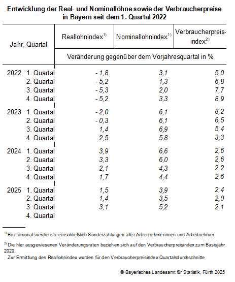 Fürth. Die nominalen Verdienste der Arbeitnehmerinnen und Arbeitnehmer in Bayern steigen im dritten Quartal 2025 um durchschnittlich 5,2 Prozent gegenüber dem Vorjahresquartal. Die Verbraucherpreise nehmen im dritten Quartal 2025 um 2,1 Prozent gegenüber dem Vorjahreszeitraum zu. Somit steigen die realen (preisbereinigten) Bruttomonatsverdienste einschließlich Sonderzahlungen aller Arbeitnehmerinnen und Arbeitnehmer im selben Zeitraum durchschnittlich um 3,1 Prozent. Damit fällt die Reallohnsteigerung höher aus als in den ersten beiden Quartalen des Jahres 2025.