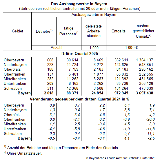 Im dritten Quartal 2025 zeigt sich ein verhaltenes Bild im bayerischen Ausbaugewerbe. Während die Zahl der einbezogenen Betriebe nahezu stabil bleibt, sinkt der ausbaugewerbliche Umsatz um 95,50 Millionen Euro bzw. 2,5 Prozent. Auffällig sind die deutlichen Umsatzrückgänge in mehreren Regierungsbezirken, die insgesamt nicht durch die realisierten Zuwächse in Oberbayern, Niederbayern und Mittelfranken ausgeglichen werden können.