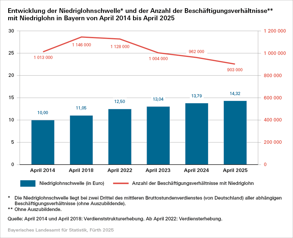 Für 903 000 abhängige Beschäftigungsverhältnisse in Bayern liegt der Lohn im April 2025 unterhalb der bundeseinheitlichen Niedriglohnschwelle von 14,32 Euro brutto je Stunde. Die Anzahl der Jobs im Niedriglohnbereich hat im Vergleich zum April 2024 um 59 000 abgenommen. Im April 2025 gehören dem Niedriglohnsektor 13,0 Prozent aller abhängigen Beschäftigungsverhältnisse im Freistaat an. Frauen sind mit einem Anteil von 15,8 Prozent häufiger im Niedriglohnsektor beschäftigt als Männer mit einem Anteil von 10,5 Prozent. Die Lohnspreizung zwischen Gering- und Besserverdienenden hat innerhalb eines Jahres abgenommen.
