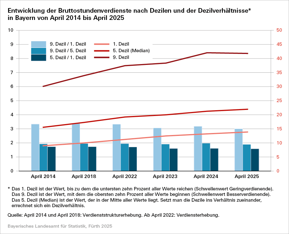 Im Zeitraum von April 2024 bis April 2025 sind die Bruttostundenverdienste der Geringverdienenden (am 1. Dezil) um 5,1 Prozent gestiegen. Dagegen sind die Bruttostundenverdienste der Besserverdienenden (am 9. Dezil) mit einem Minus von 0,6 Prozent leicht gesunken. Der mittlere Bruttostundenverdienst (5. Dezil bzw. Median), der von gleich vielen Beschäftigten unter- wie überschritten wird, beläuft sich in Bayern im April 2025 auf 21,98 Euro. Im Vergleich zum April 2024 (21,27 Euro) hat er um 3,3 Prozent zugenommen. Zum Vergleich: Der gesetzliche Mindestlohn ist im betrachteten Zeitraum um 3,3 Prozent gestiegen.