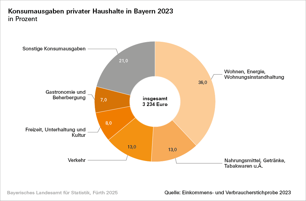 Fürth. Nach den Ergebnissen der Einkommens- und Verbrauchsstichprobe 2023 gab der Durchschnittshaushalt in Bayern 3 234 Euro im Monat für den privaten Konsum aus. An der bundesweiten Erhebung nahmen in Bayern 7 908 Haushalte teil, die jeweils über drei Monate hinweg ihre Einnahmen und Ausgaben detailliert dokumentierten. Die Stichprobe repräsentiert rund 6,4 Millionen Haushalte in Bayern (ohne Haushalte mit einem monatlichen Haushaltsnettoeinkommen von regelmäßig 18 000 Euro oder mehr).