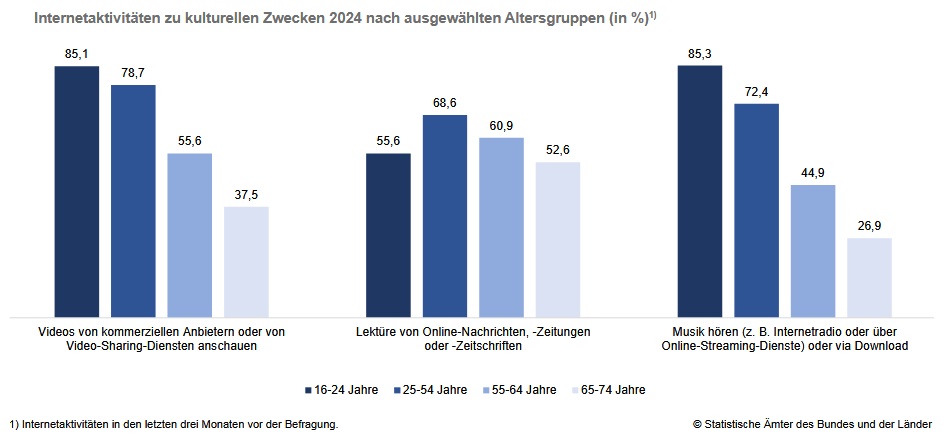 Während traditionelle Kulturorte rückläufig sind, nimmt die Nutzung digitaler Kulturan-gebote in Deutschland deutlich zu. Zwischen 2022 und 2024 steigt der Anteil der 16- bis 74-Jährigen, die Musik über Internetradio, Streaming oder Downloads hören, von 44,0 auf 61,2 Prozent, wobei besonders junge Menschen (16-24 Jahre) mit 85,3 Pro-zent diese Angebote nutzen. Ähnlich entwickelt sich der Konsum von Onlinevideos, der im gleichen Zeitraum von 45,8 auf 68,3 Prozent mit einem besonders hohen Anteil bei den 16- bis 24-Jährigen (85,1 Prozent) zunimmt. Ältere Altersgruppen greifen deutlich seltener auf digitale Musik- und Videoinhalte zurück.