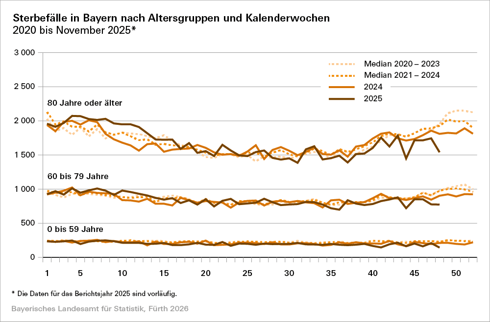 Fürth. Wie das Expertenteam des Bayerischen Landesamts für Statistik nach Auswertung vorläufiger Daten mitteilt, ist die Zahl der Verstorbenen im Freistaat im November 2025 mit 11 096 Personen insgesamt niedriger als der Median der Jahre 2021 bis 2024 (12 766 Verstorbene). Dabei ist zu beachten, dass in die Berechnung des Medians der Jahre 2021 bis 2024 teilweise Jahre mit pandemiebedingt hohen Sterbefallzahlen einfließen, wodurch der Vergleichswert für das Jahr 2025 relativ hoch ist.