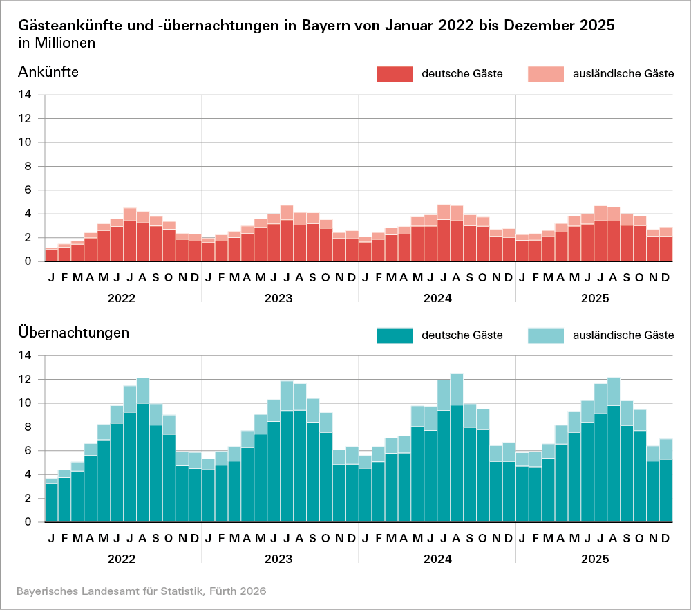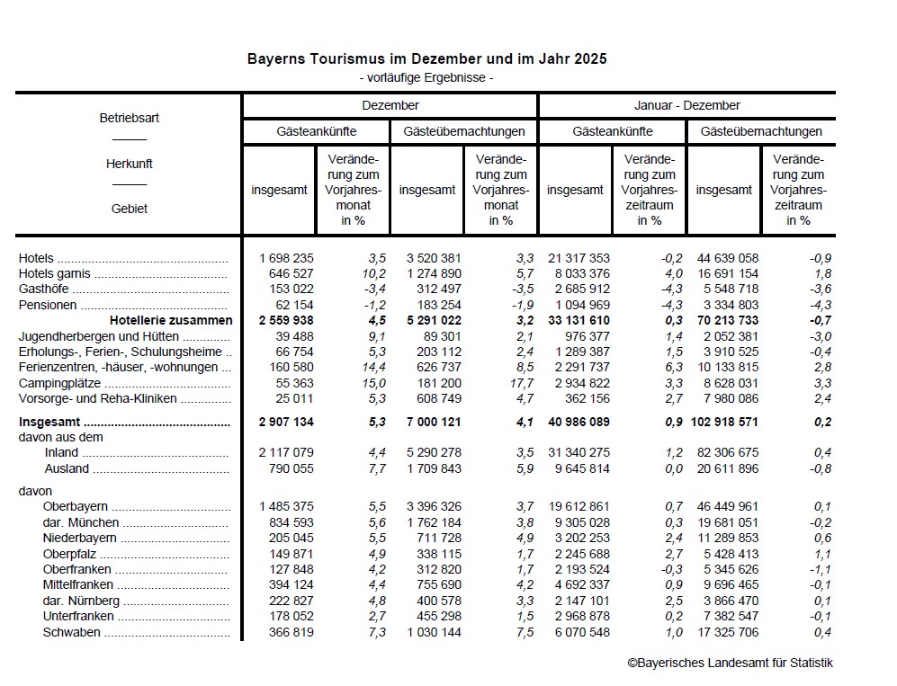 Zum Abschluss des Berichtsjahres 2025 liegt die Zahl der Übernachtungen erneut im dreistelligen Millionenbereich. Nach den Ergebnissen der monatlichen Erhebung im Tourismus des Bayerischen Landesamtes für Statistik werden in den rund 11 000 geöffneten bayerischen Beherbergungsbetrieben*) knapp 41,0 Millionen Gästeankünfte und rund 102,9 Millionen Übernachtungen für das Jahr 2025 registriert. Damit übertreffen die Gästeankünfte die Vorjahreswerte um 0,9 Prozent. Die Übernachtungen liegen mit 0,2 Prozent knapp über dem Niveau von 2024.