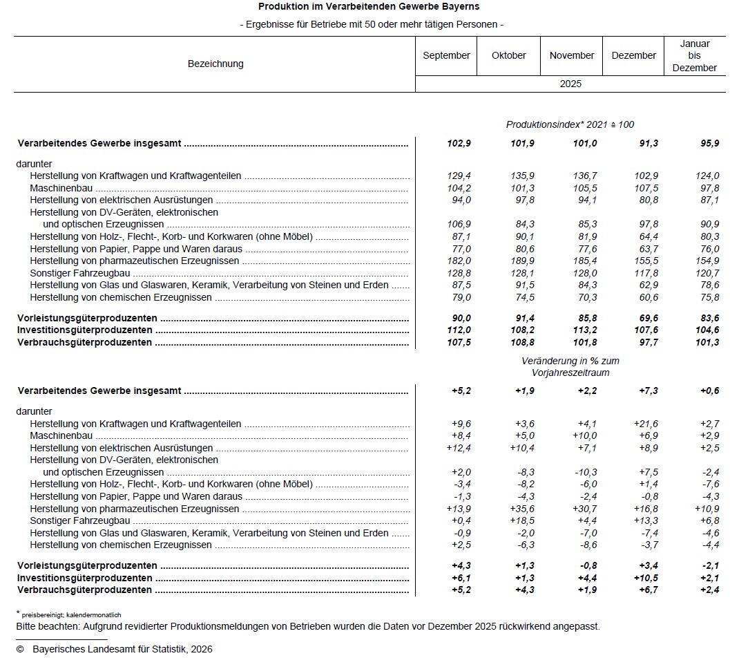 „Index der Produktion für das Verarbeitende Gewerbe in Bayern im Dezember 2025“ (Bestellnummer: E1200C 202512).