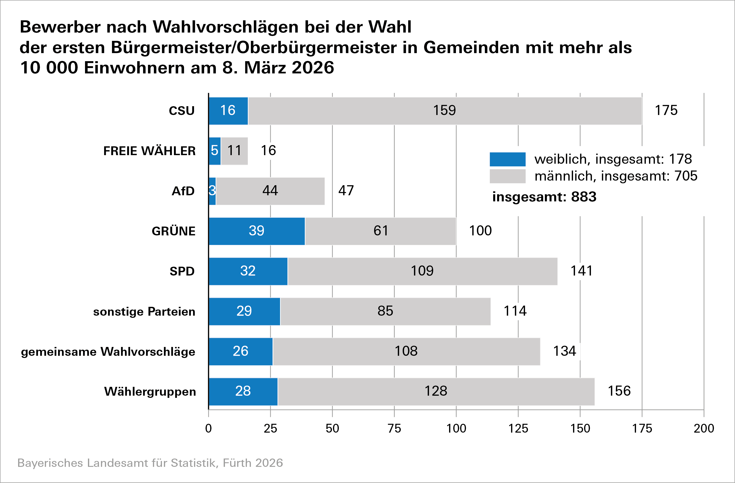 Am Abend des Wahlsonntags wird das Bayerische Landesamt für Statistik laufend die eingehenden Ergebnisse der Schnellmeldungen verarbeiten und veröffentlichen. Die Veröffentlichung umfasst die Oberbürgermeisterwahlen in den kreisfreien Städten, die (Ober-)Bürgermeisterwahlen in den kreisangehörigen Gemeinden mit mehr als 10 000 Einwohnern und die Landratswahlen in den Landkreisen. Über die Bewerberinnen und Bewerber bei diesen Wahlen informiert das Bewerberheft des Landesamts. Zudem enthält die Publikation Übersichten zu den Wahlvorschlägen bei den Stadtratswahlen in den kreisfreien Städten und den Kreistagswahlen in den Landkreisen, bei denen sich insgesamt 42 057 Personen (darunter Frauen: 14 664 bzw. 34,9 Prozent) um ein Mandat bewerben.