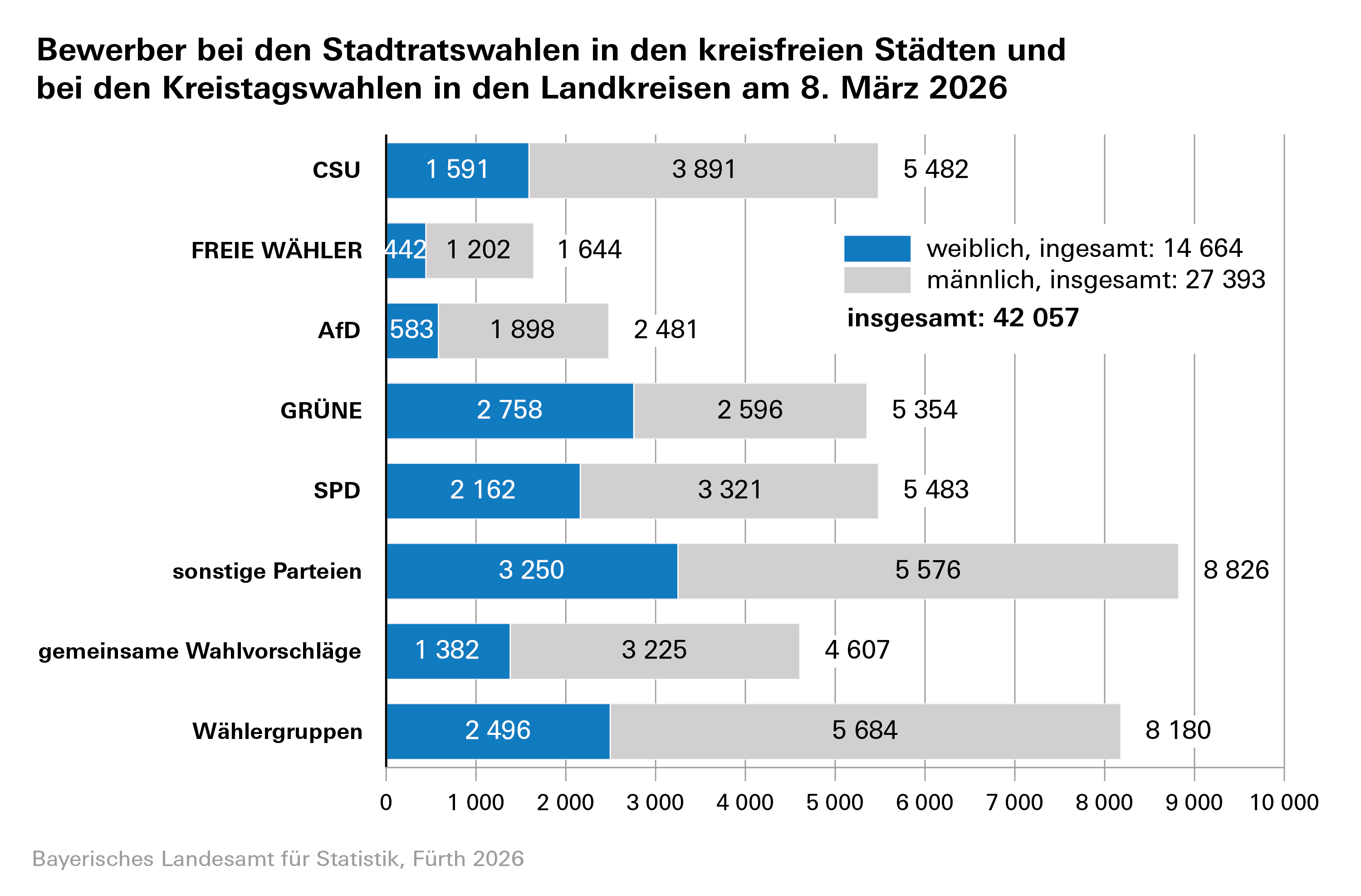Zu den Stadtratswahlen in den 25 kreisfreien Städten stellen sich am 8. März 2026 insgesamt 10 132 Bewerber zur Wahl (darunter 4 025 Frauen: 39,7 Prozent) und bei den Kreistagswahlen in den 71 Landkreisen 31 925 Bewerber (darunter 10 639 Frauen: 33,3 Prozent).