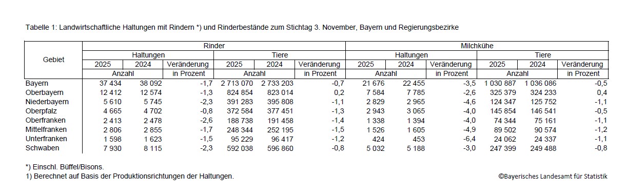 Ergänzend zu den bayernweiten Ergebnissen der Rinderbestandserhebung veröffentlicht das Fachteam des Bayerischen Landesamts für Statistik Auswertungen auf regionaler Ebene. Danach werden zum Stichtag 3. November 2025 in Bayern 37 434 Rinderhaltungen mit einem Rinderbestand von insgesamt 2 713 070 Tieren gezählt. Die Zahl der Bestände an Rindern und an Milchkühen geht in fast allen Regierungsbezirken zurück. Durchschnittlich verfügen Milchkuhhalter in Bayern über 48 Tiere. Die im Durchschnitt größten Bestände an Milchkühen gibt es in Mittelfranken mit 59 Kühen, die kleinsten mit 43 Tieren in Oberbayern.