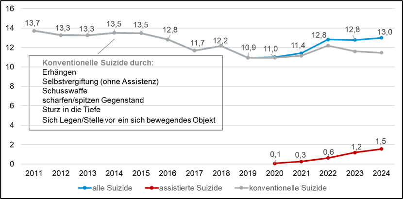 In der Zeitschrift Bayern in Zahlen wird im Artikel KONVENTIONELLE UND ASSISTIERTE SUIZIDE IN BAYERN 2020 BIS 2024 die Analyse und Auswertung ausführlich dargestellt: