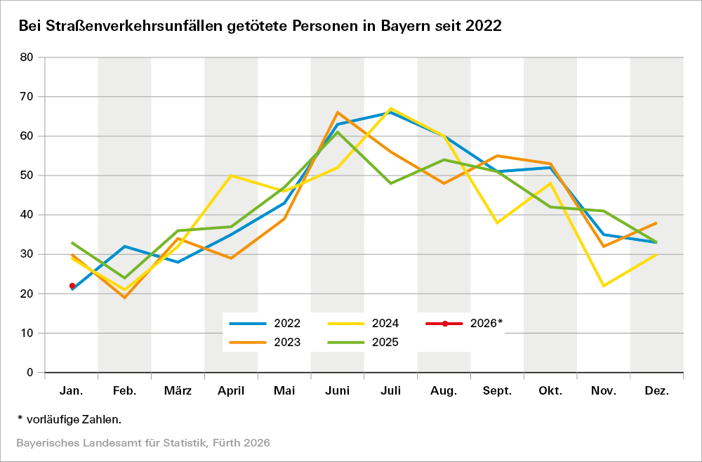 Ausführliche Ergebnisse wird der im April 2026 erscheinende Statistische Bericht „Straßenverkehrsunfälle in Bayern im Januar 2026 (H1101C 202601)“ enthalten.
