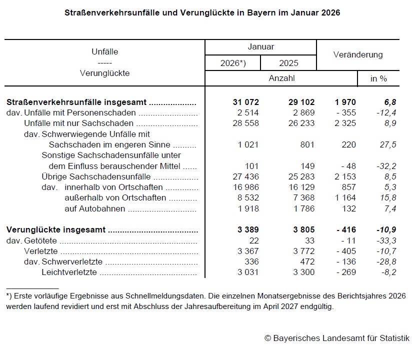Nach den vorläufigen Meldungen der Polizei ereigneten sich im Januar 2026 auf Bayerns Straßen insgesamt 31 072 Unfälle. Das sind 6,8 Prozent mehr als im Vorjahresmonat. Wie das Bayerische Landesamt für Statistik weiter mitteilt, sank dabei die Zahl der Unfälle mit Personenschaden jedoch um 12,4 Prozent. Die Zahl der Verunglückten verringerte sich um 10,9 Prozent auf 3 389 Personen. Im Januar 2026 wurden 22 Verkehrsteilnehmer getötet, elf weniger als im Januar des Vorjahres. Bei Unfällen mit nur Sachschaden ist eine Zunahme um 8,9 Prozent zu verzeichnen.