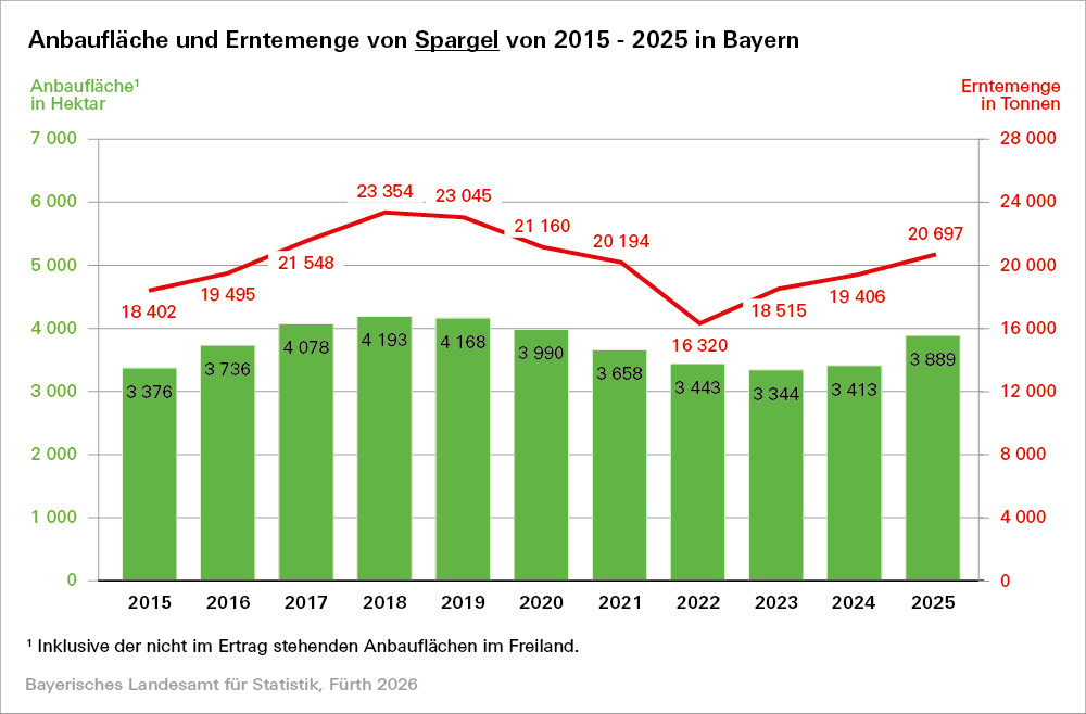 Nach den endgültigen Ergebnissen der Gemüsehaupterhebung 2025 wird das Edelgemüse Spargel in Bayern auf 3 889 Hektar angebaut. Auf Flächen im Ertrag werden durchschnittlich 62,9 Dezitonnen je Hektar geerntet, dementsprechend liegt die Erntemenge im Jahr 2025 bei rund 20 697 Tonnen Spargel. Erdbeeren werden auf rund 1 571 Hektar angebaut.