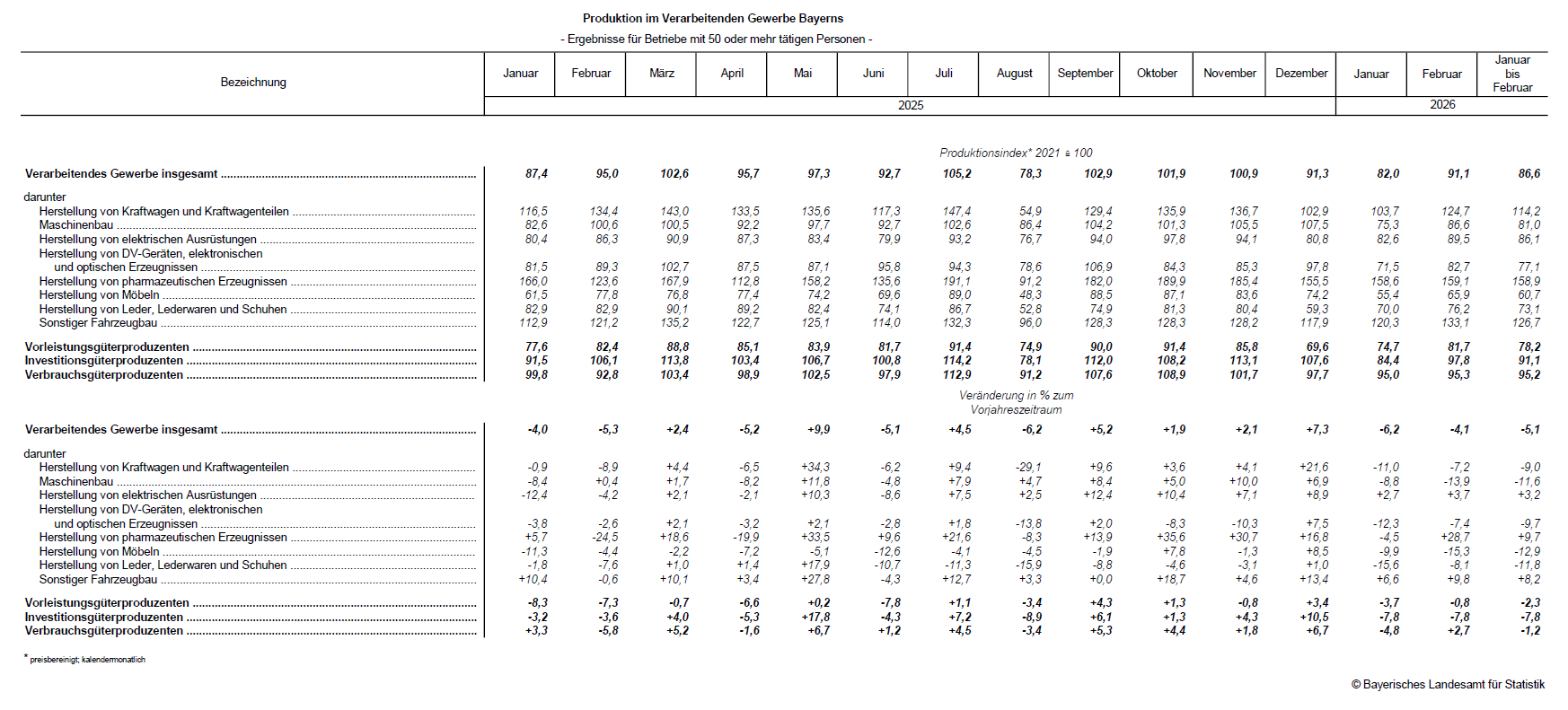 Bei Betrachtung der einzelnen Branchen des Verarbeitenden Gewerbes bleiben im bisherigen Jahresverlauf 2026 vor allem die „Herstellung von Möbeln“ (-12,9 Prozent) und die „Herstellung von Leder, Lederwaren und Schuhen“ (-11,8 Prozent) hinter dem Ergebnis des Vorjahreszeitraumes zurück. Auch in Bayerns gewichtigen Wirtschaftszweigen „Maschinenbau“ (‑11,6 Prozent) und „Herstellung von Kraftwagen und Kraftwagenteilen“ (-9,0 Prozent) werden deutliche Produktionsrückgänge verzeichnet. Dagegen verbuchen insbesondere die „Herstellung von pharmazeutischen Erzeugnissen“ (+9,7 Prozent) und der „Sonstige Fahrzeugbau“ (+8,2 Prozent) spürbare Produktionssteigerungen.