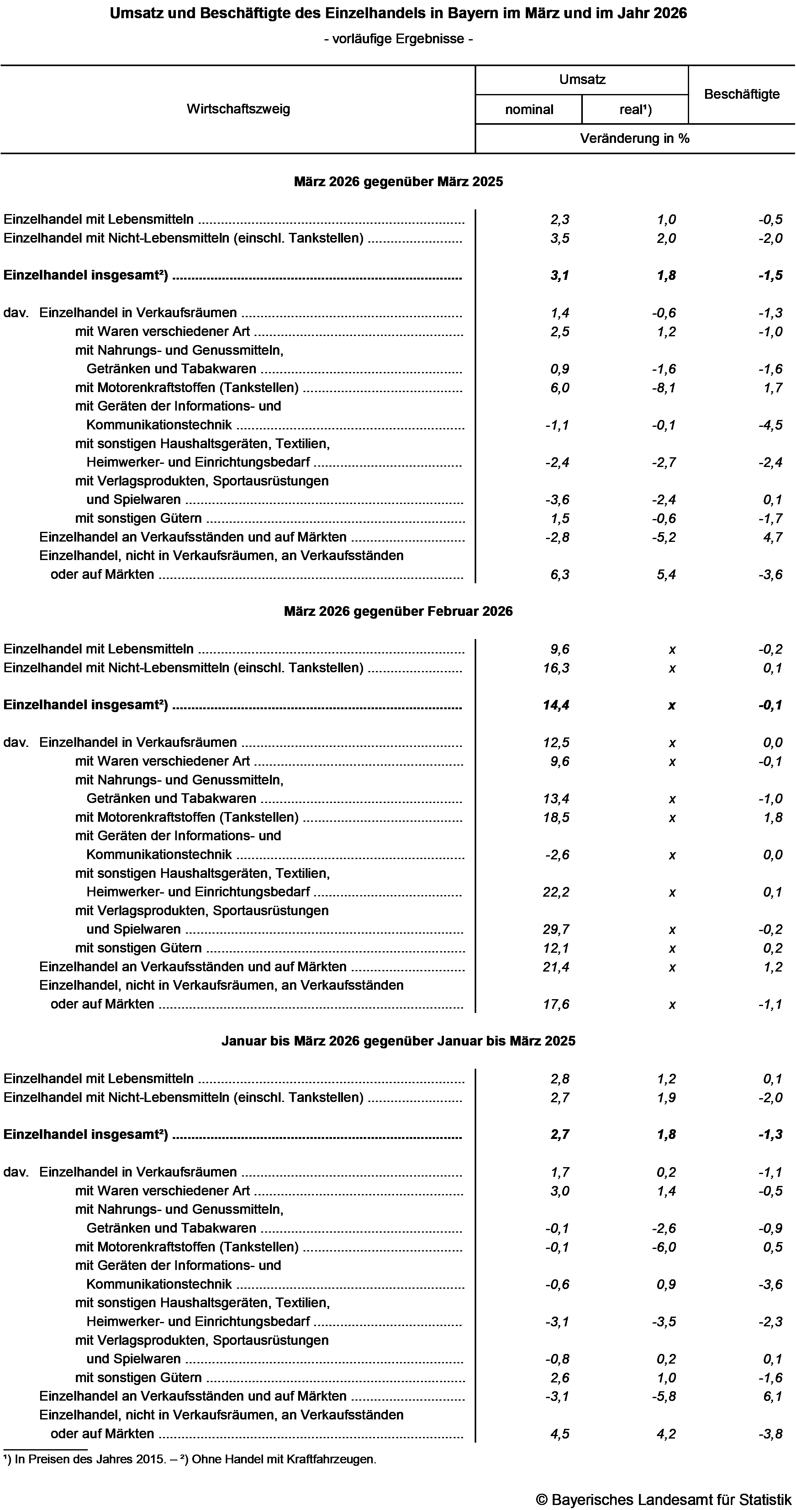 Nach den ersten vorläufigen Ergebnissen des Bayerischen Landesamts für Statistik zur „Monatsstatistik im Einzelhandel“ steigt der nominale Umsatz im bayerischen Einzelhandel (ohne Kraftfahrzeughandel) im ersten Quartal 2026 gegenüber dem Vorjahreszeitraum um 2,7 Prozent und der reale Umsatz um 1,8 Prozent. Die Zahl der Beschäftigten sinkt um 1,3 Prozent. Im März 2026 wächst der nominale Umsatz des Einzelhandels in Bayern gegenüber dem März 2025 um 3,1 Prozent und der reale Umsatz um 1,8 Prozent. Die Zahl der Beschäftigten geht um 1,5 Prozent zurück. Auffallend die Entwicklung des Umsatzes der Tankstellen infolge des Iran-Krieges: Während der nominale Umsatz um 6,0 Prozent steigt, geht der reale (preisbereinigte) Umsatz um 8,1 Prozent zurück.