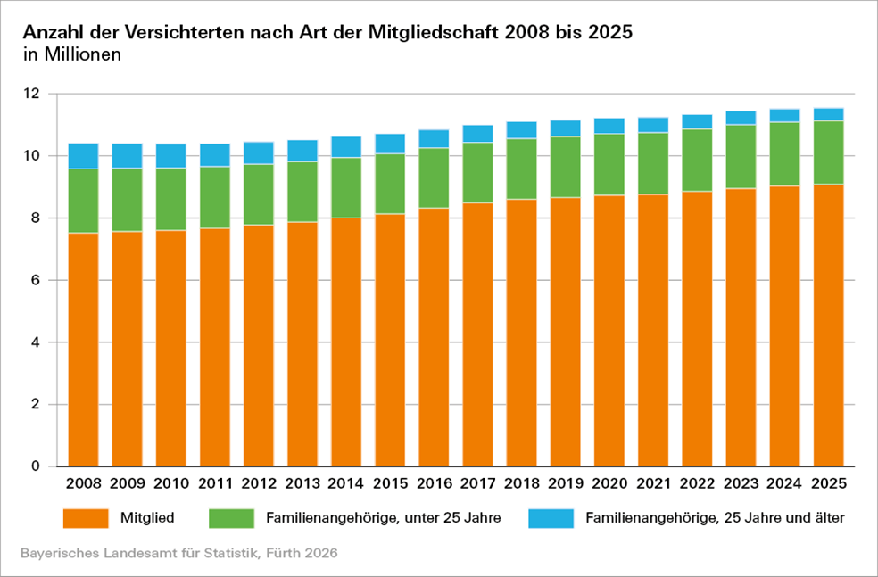 Mit 87 Prozent ist der überwiegende Anteil der bayerischen Bevölkerung Mitglied in der GKV. Nach aktuellen Zahlen der gesetzlichen Krankenkassen sind von den GKV-Mitgliedern im Jahr 2025 insgesamt 21,4 Prozent beitragsfrei als Familienangehörige mitversichert. Diese Gruppe umfasst insbesondere Kinder sowie Ehegatten. Kinder können bis zum Alter von 25 Jahren beitragsfrei mitversichert sein. Die aktuellen Reformüberlegungen betreffen die Gruppe der mitversicherten Ehegatten, wenn sie nicht Kinder unter 7 Jahren, Kinder mit Behinderung oder pflegebedürftige Angehörige betreuen und auch nicht bereits Rente beziehen. Da aus den Daten der gesetzlichen Krankenkassen nur das Alter der beitragsfrei Mitversicherten hervorgeht, kann der Kreis der ggf. betroffenen Ehegatten nur geschätzt werden. Betrachtet man deswegen ausschließlich die mitversicherten Personen im Alter von 25 Jahren und älter, zeigt sich, dass deren Anteil an allen GKV-Versicherten in Bayern kontinuierlich rückläufig ist und von 8,0 Prozent im Jahr 2008 auf