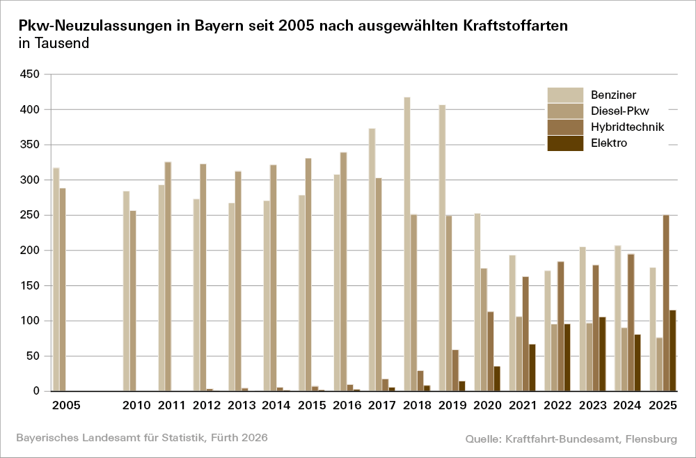 Pkw-Neuzulassungen in Bayern nach ausgewählten Kraftstoffarten